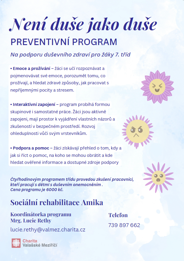 Sociální rehabilitace Amika spouští nový preventivní program pro základní školy s názvem Není duše jako duše, který je určený žákům 7. tříd. Program reaguje na narůstající potřebu podpory duševního zdraví dětí a dospívajících a nabízí bezpečný prostor pro otevřené mluvení o emocích, prožívání a vzájemné podpoře.