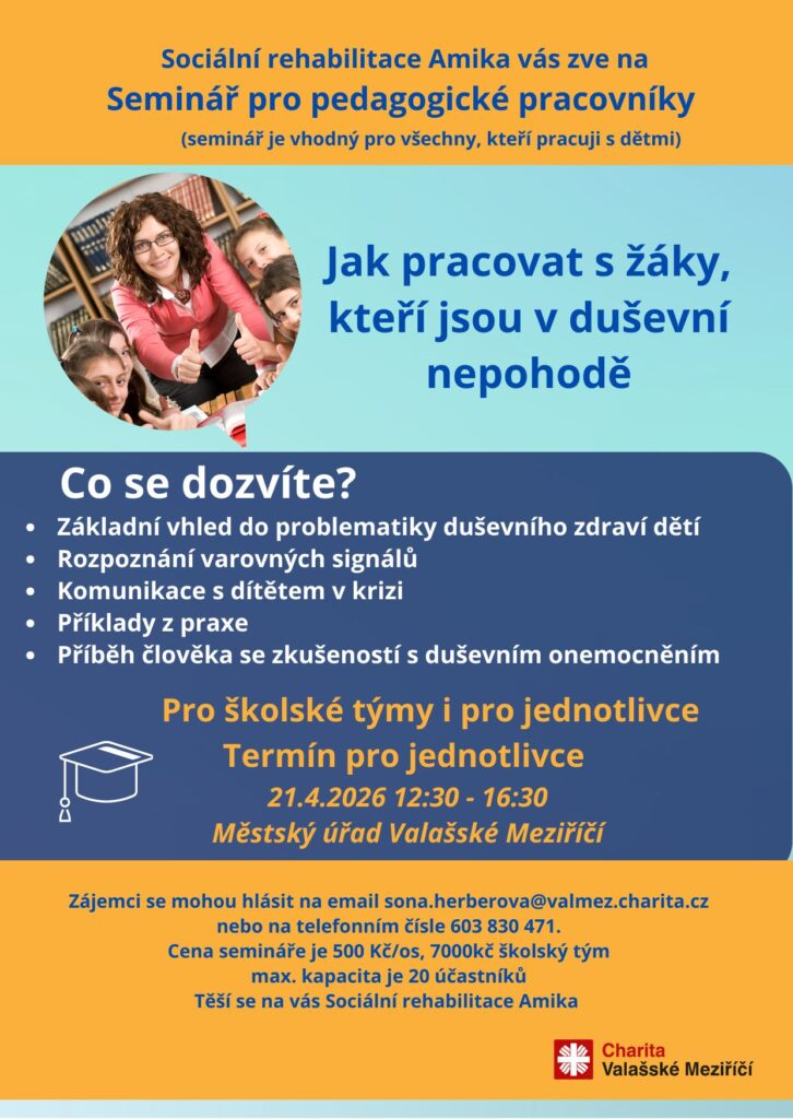 Tento seminář budeme realizovat ve dvou termínech a to 26. 8. 2025 od 8:30 a 14. 10. 2025 od 12:30. Kapacita seminářů je omezena na 20 účastníku a v případě velkého zájmu je možnost přidat další termín. Cena semináře je 500kč na osobu. Zájemci se můžou hlásit na email sona.herberova@valmez.charita.cz
